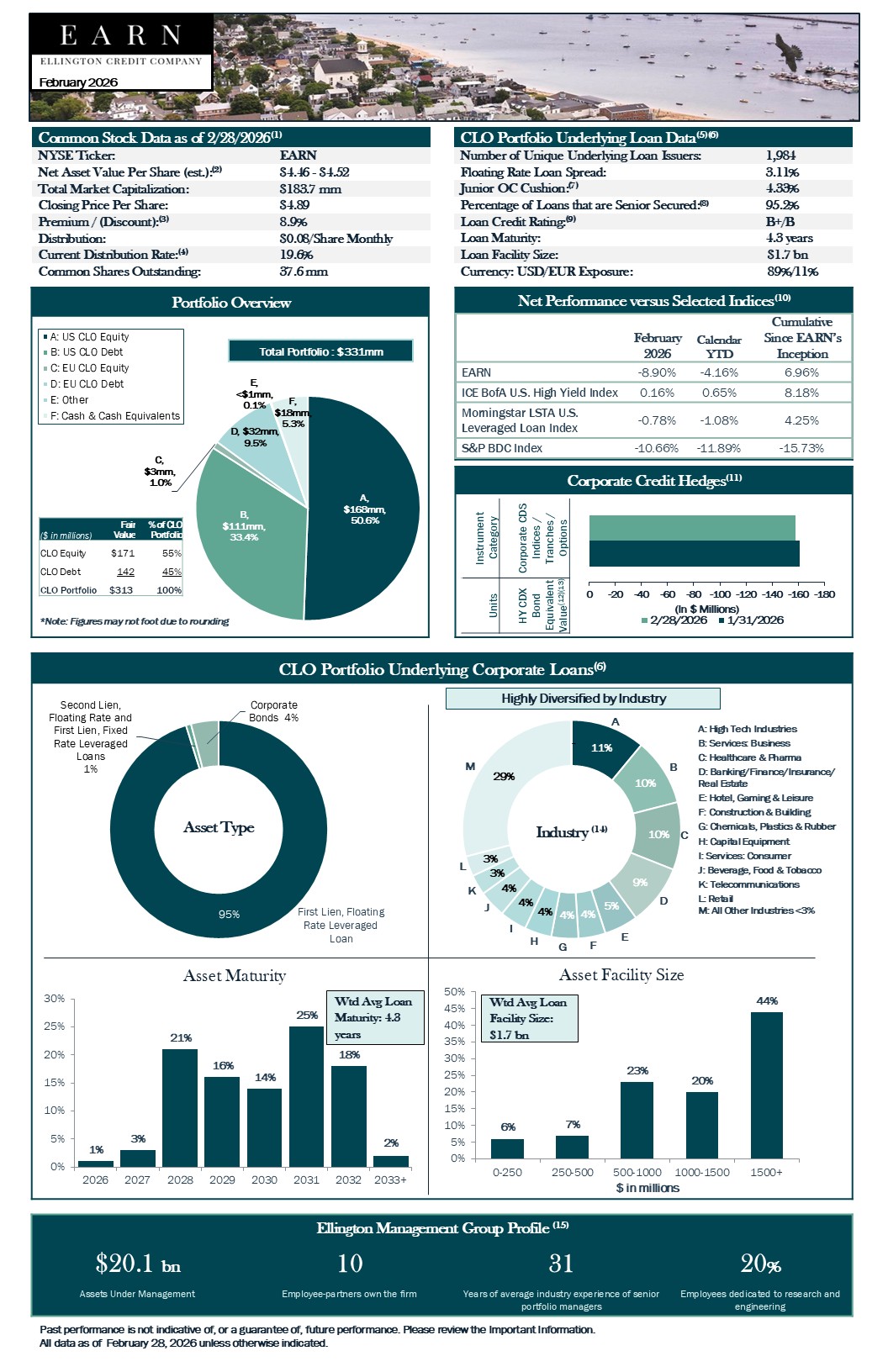 Past performance is not indicative of, or a guarantee of, future performance. Please review the Important Information. All data as of February 28, 2026 unless otherwise indicated. A , $168mm , 50.6% B , $111mm , 33.4% C , $3mm , 1.0% D , $32mm , 9.5% E , <$1mm, 0.1% F , $18mm , 5.3% A: US CLO Equity B: US CLO Debt C: EU CLO Equity D: EU CLO Debt E: Other F: Cash & Cash Equivalents Total Portfolio : $331mm Portfolio Overview CLO Portfolio Underlying Corporate Loans (6) -180 -160 -140 -120 -100 -80 -60 -40 -20 0 (In $ Millions) 2/28/2026 1/31/2026 1% 3% 21% 16% 14% 25% 18% 2% 0% 5% 10% 15% 20% 25% 30% 2026 2027 2028 2029 2030 2031 2032 2033+ 95% Second Lien, Floating Rate and First Lien, Fixed Rate Leveraged Loans 1% Corporate Bonds , 4% Asset Type 11% 10% 10% 9% 5% 4% 4% 4% 4% 4% 3% 3% 29% - Industry (14) M B C D A E G H I F J L K 6% 7% 23% 20% 44% 0% 5% 10% 15% 20% 25% 30% 35% 40% 45% 50% 0-250 250-500 500-1000 1000-1500 1500+ $ in millions Asset Facility Size Asset Maturity First Lien, Floating Rate Leveraged Loan A: High Tech Industries B: Services: Business C: Healthcare & Pharma D: Banking/Finance/Insurance/ Real Estate E: Hotel, Gaming & Leisure F: Construction & Building G: Chemicals, Plastics & Rubber H: Capital Equipment I: Services: Consumer J: Beverage, Food & Tobacco K: Telecommunications L: Retail M: All Other Industries <3% February 2026 Common Stock Data as of 2/28/2026 (1) EARN NYSE Ticker: $4.46 - $4.52 Net Asset Value Per Share (est.): (2) $183.7 mm Total Market Capitalization: $4.89 Closing Price Per Share: 8.9% Premium / (Discount): (3) $0.08/Share Monthly Distribution: 19.6% Current Distribution Rate: (4) 37.6 mm Common Shares Outstanding: CLO Portfolio Underlying Loan Data (5)(6) 1,984 Number of Unique Underlying Loan Issuers: 3.11% Floating Rate Loan Spread: 4.33% Junior OC Cushion: (7) 95.2% Percentage of Loans that are Senior Secured: (8) B+/B Loan Credit Rating: (9) 4.3 years Loan Maturity: $1.7 bn Loan Facility Size: 89%/11% Currency: USD/EUR Exposure: Net Performance versus Selected Indices (10) Cumulative Since EARN’s Inception Calendar YTD February 2026 6.96% - 4.16% - 8.90% EARN 8.18% 0.65% 0.16% ICE BofA U.S. High Yield Index 4.25% - 1.08% - 0.78% Morningstar LSTA U.S. Leveraged Loan Index - 15.73% - 11.89% - 10.66% S&P BDC Index Highly Diversified by Industry Ellington Management Group Profile (15) 20 % 31 10 $20.1 bn Employees dedicated to research and engineering Years of average industry experience of senior portfolio managers Employee - partners own the firm Assets Under Management Wtd Avg Loan Maturity: 4 .3 years Wtd Avg Loan Facility Size: $1.7 bn % of CLO Portfolio Fair Value ($ in millions) 55% $171 CLO Equity 45% 142 CLO Debt 100% $313 CLO Portfolio Corporate CDS Indices / Tranches / Options Instrument Category HY CDX Bond Equivalent Value (12)(13) Units *Note: Figures may not foot due to rounding Corporate Credit Hedges (11)